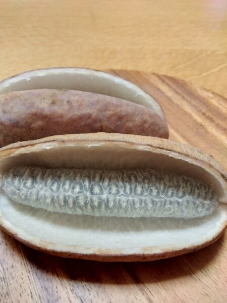 アケビ 投稿者: studiovigor2025年10月30日2025年10月30日つぶやき 高浜町の公民館「うらら」でレッスン。 この日は体操半分、雑談半分で凄く盛り上がった。 帰りに職員さんから「アケビ」を頂いた。皆さん馴染みが無いらしく食べ方も分からないと言うことで3個頂くことに。殆ど種。味はネットリして美味しかった。 子供の頃は実家にアケビの木があってよく食べていた。子供の頃を思い出して味わった。